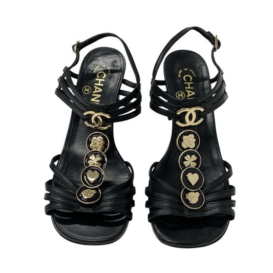 Chanel Sandals Shoes Leather Black Gold Coco Mark Icon Strap