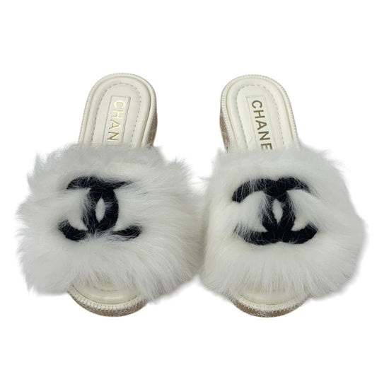 Chanel Sandals Shoes Fur White Black Coco Mark Mules