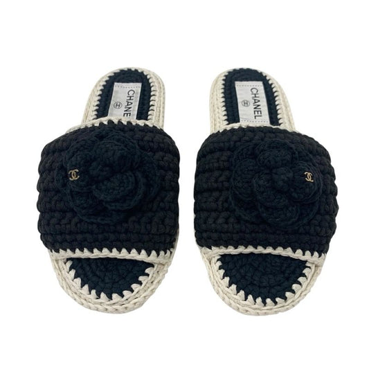 Chanel Sandals Shoes Fabric Black White Coco Mark Camellia Knit Flat Mule