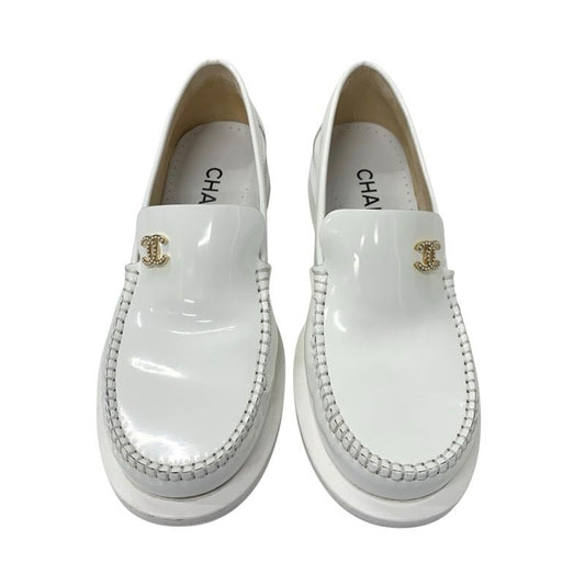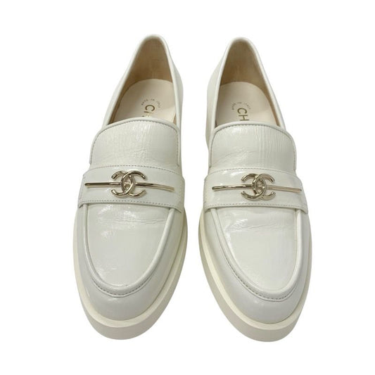 Chanel Loafer Leather Shoes Patent Leather White Gold Here Mark