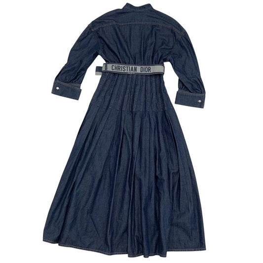 Christian DIOR Dress Cotton Blue Silver Denim Short Sleeve Logo Belt Fleece Long