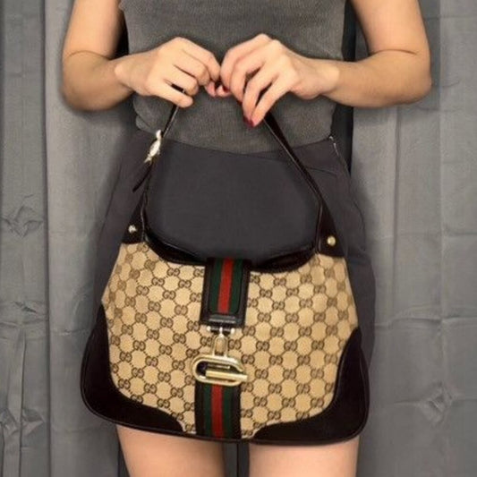 Authentic GUCCI GG Jackie Sherry Web Canvas Handbag Shoulder Bag Charm Ophidia
