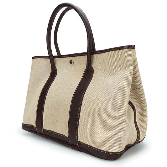Hermes Handbag Garden Party PM Canvas Leather Beige Dark Brown Silver Hardware
