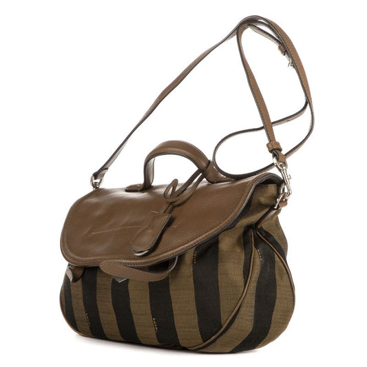 Fendi Flap Messenger Top Handle Brown Pecan Stripe Canvas Calfskinleather A
