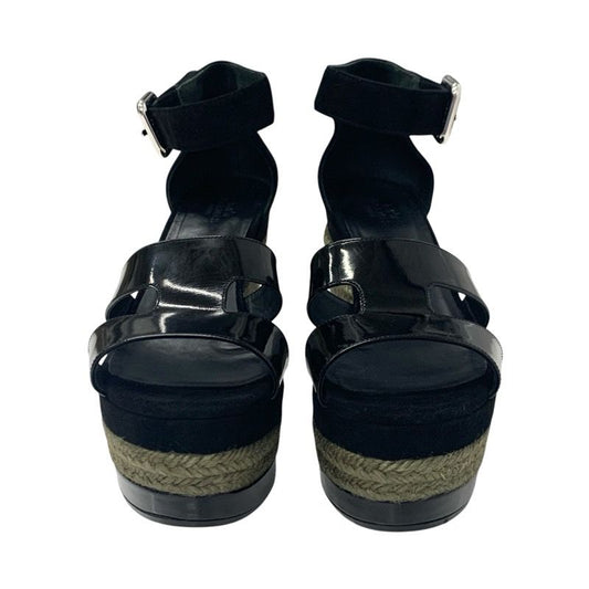 Hermes Ilana Sandals Shoes Patent Suede Black Wedge Sole Strap