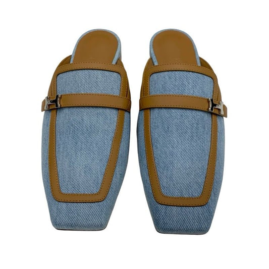 Hermes Groupie Flat Shoes Denim Leather Light Blue Brown Unused Mule Slipper