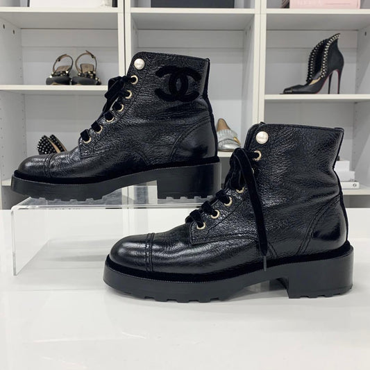 Chanel Cocomark Leather Velor Pearl Lace-up Short Boots