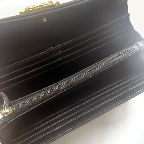 This is an authentic CHANEL Boy Chevron CC Lambskin Leather Wallet in Black. This Wallet features the Timeless CC Boy Pushlock logo on the front flap, and opens to a matching black interior with multiple card pockets and open pockets. Gold hardware throughout. The added and removable insert and chain turns this into a wonderful daily carry that can be used as a shoulder bag, crossbody WOC, or as a clutch.