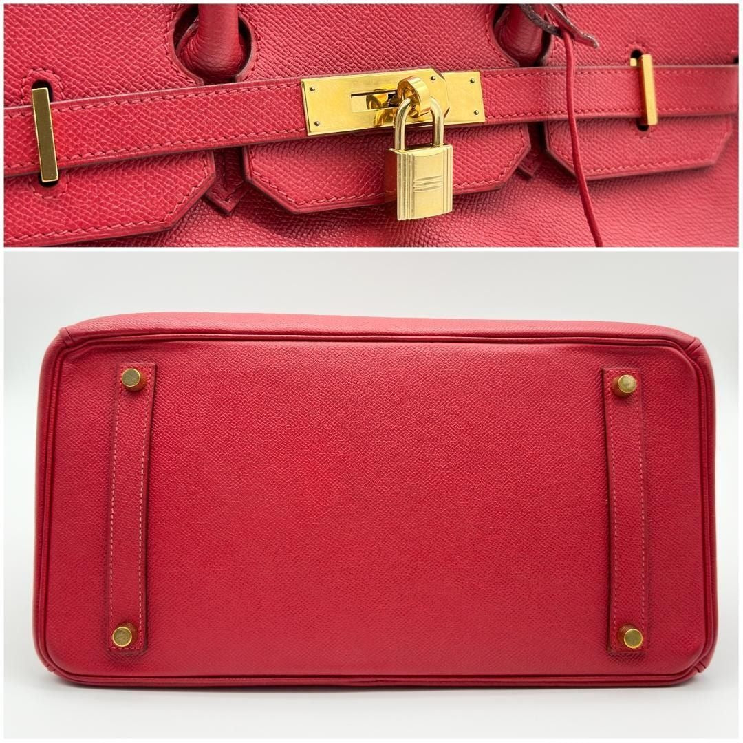 This is an authentic HERMES Epsom Birkin 35 in Rouge Vif. This chic handbag is finely crafted of Epsom leather in red. The bag features rolled leather top handles, a front flap, gold hardware including a signature Hermes padlock with a hanging clochette for the keys. The bag opens to a matching red goatskin leather lining with zipper and patch pockets. Gold hardware throughout.