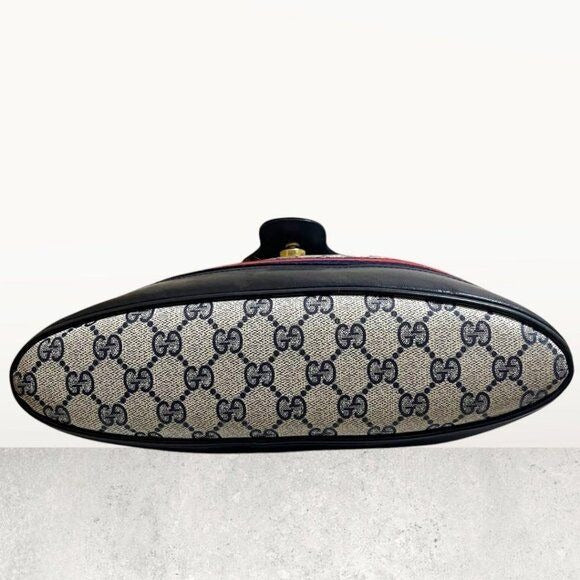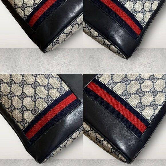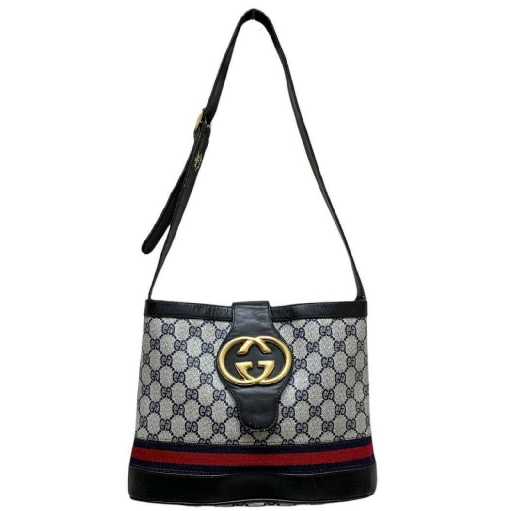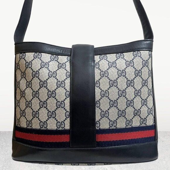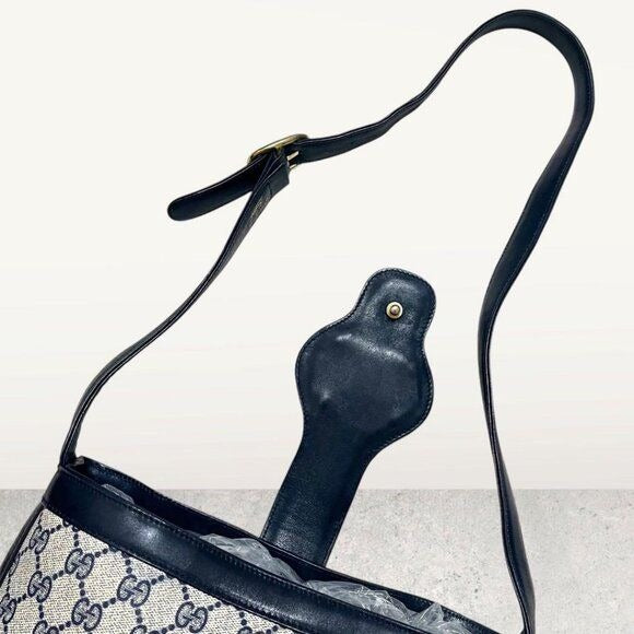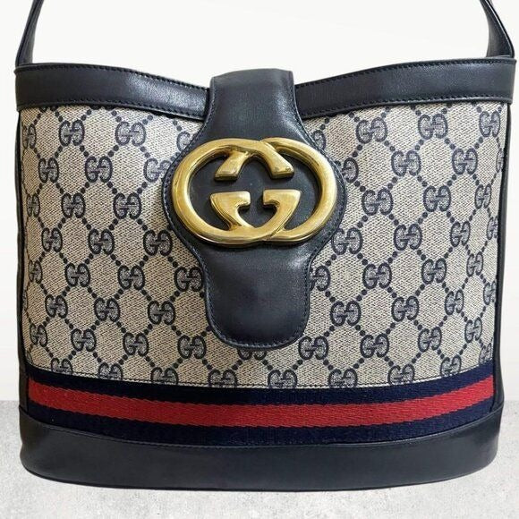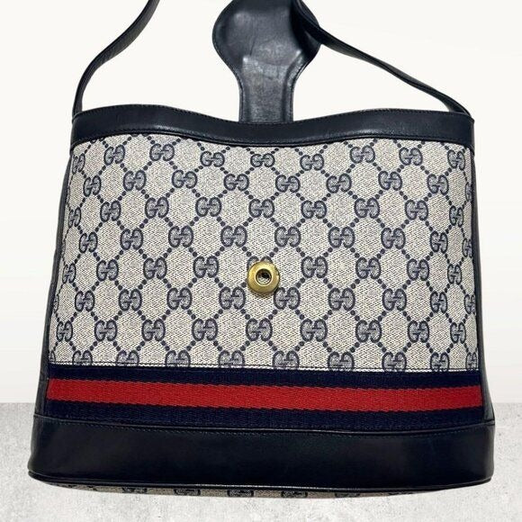 This is a RARE and authentic GUCCI GG Supreme Monogram Canvas Shoulder Bucket Tote Bag in Navy / Tan. This bag is crafted of GG navy monogram canvas, with dark navy leather trim. The bag features an adjustable dark navy blue leather shoulder strap, and a signature navy and red canvas web stripe detail on the front embellished with a large interlocking GG logo. The top opens the bag to a blue linen interior. From the 1970s Gucci Collection, this makes for an incredibly rare find, perfect for a collector!