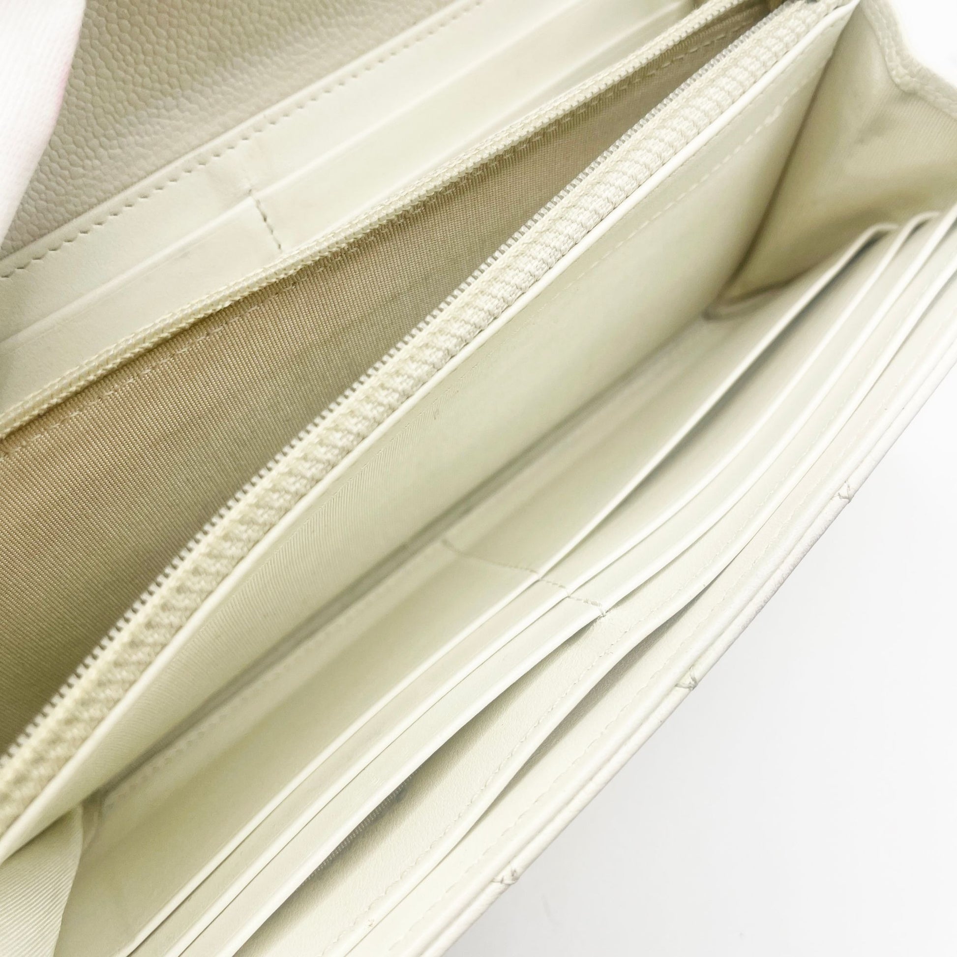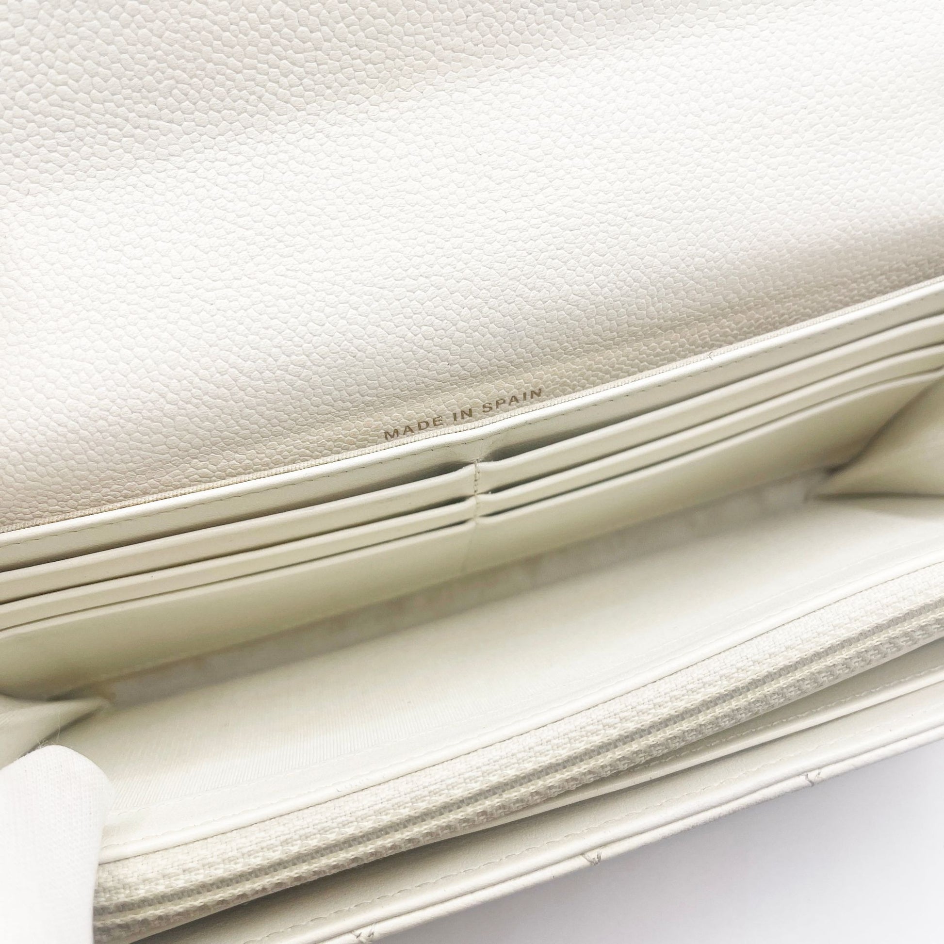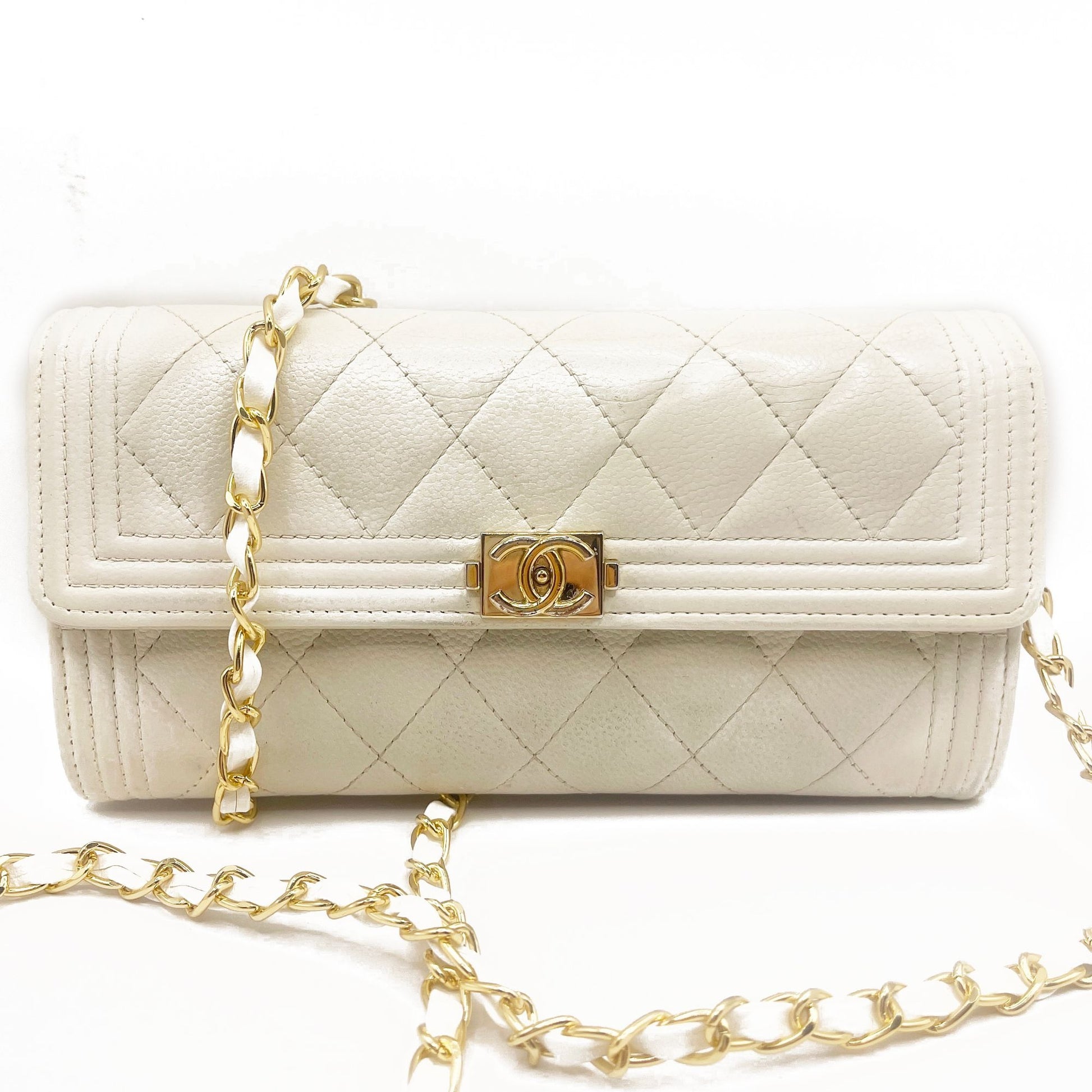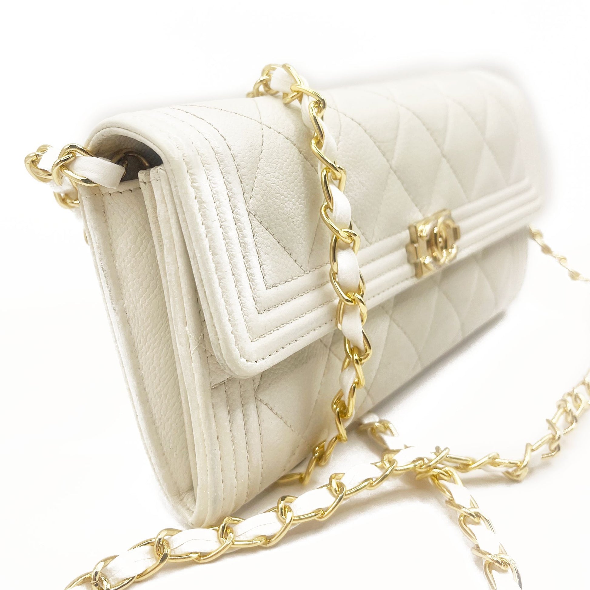This is an authentic CHANEL Boy CC Lambskin Leather Wallet in Ivory White and GHW. This Wallet features the Timeless CC Boy Pushlock logo on the front flap, and opens to a matching cream white interior with multiple card pockets and open pockets. Gold hardware throughout. The added and removable insert and chain turns this into a wonderful daily carry that can be used as a shoulder bag, crossbody WOC, or as a clutch.