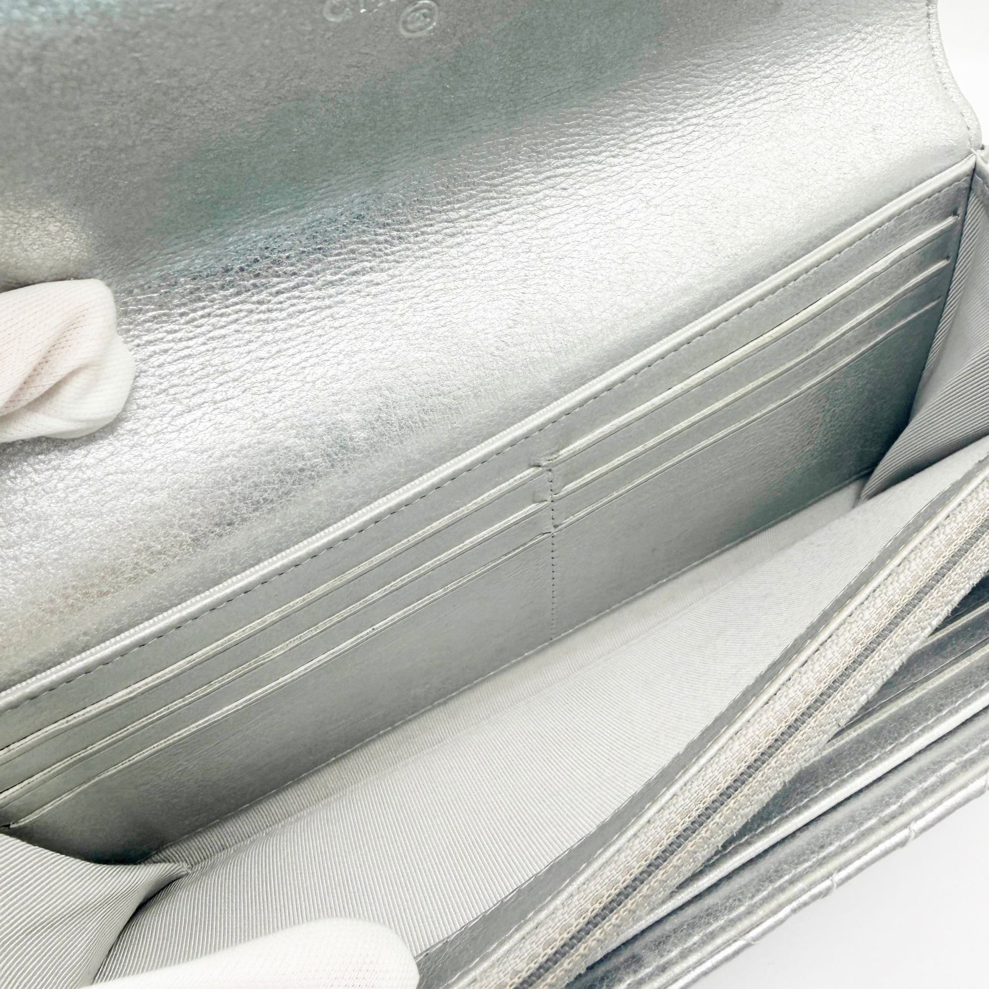This is an authentic CHANEL CC Chevron V-Stitch Timeless Classic Lambskin Leather Gusset Flap Wallet in Metallic Silver / Gray. This wallet features a silver interlocking CC logo at the front and opens to a matching silver interior with multiple card pockets, open pockets and zipper pockets. Silver hardware. This wallet features a custom added removable insert and chain, turning it into a wonderful daily carry as a shoulder bag, crossbody, or as a clutch. Serial sticker and Chanel Card intact, this is a timeless piece that will only go up in value!