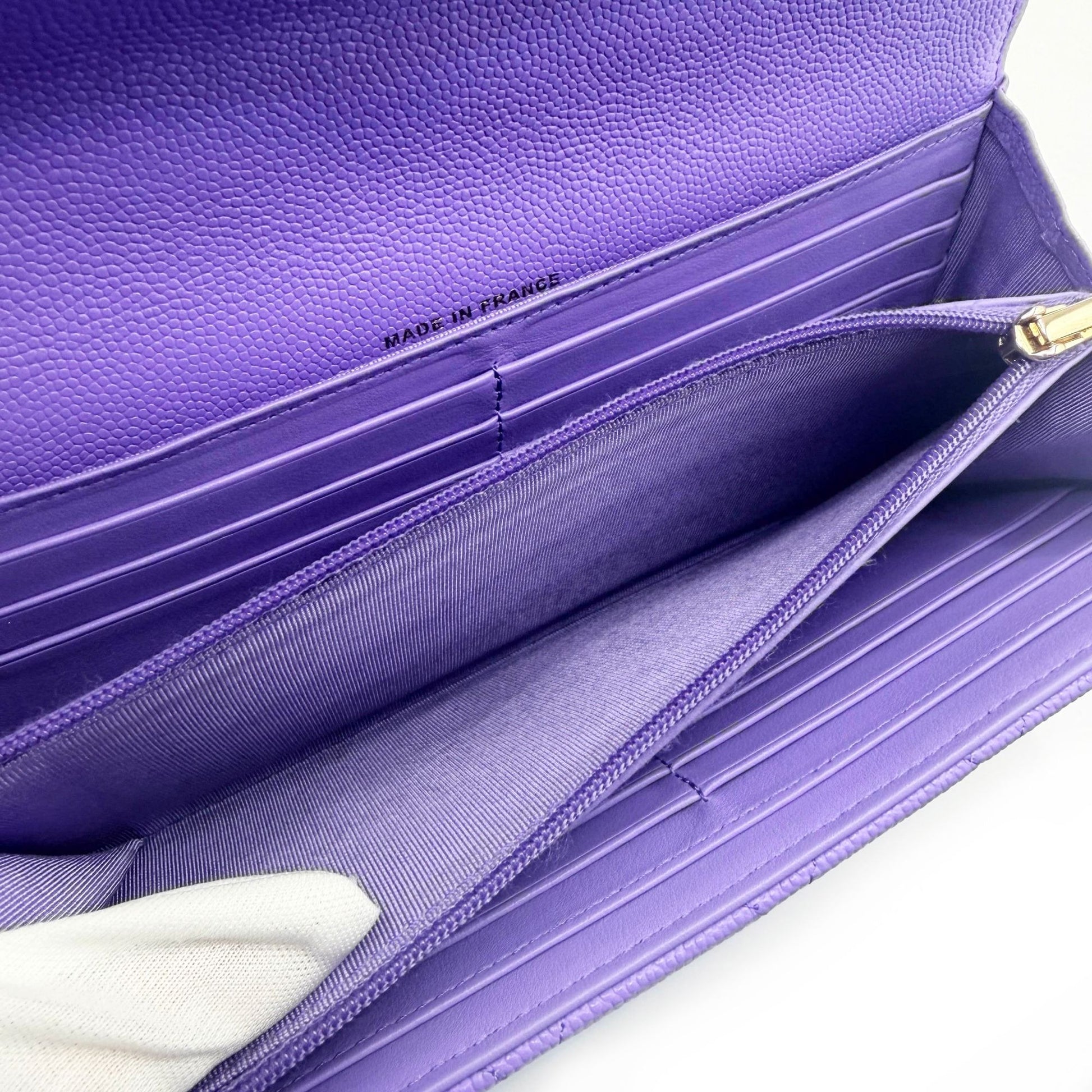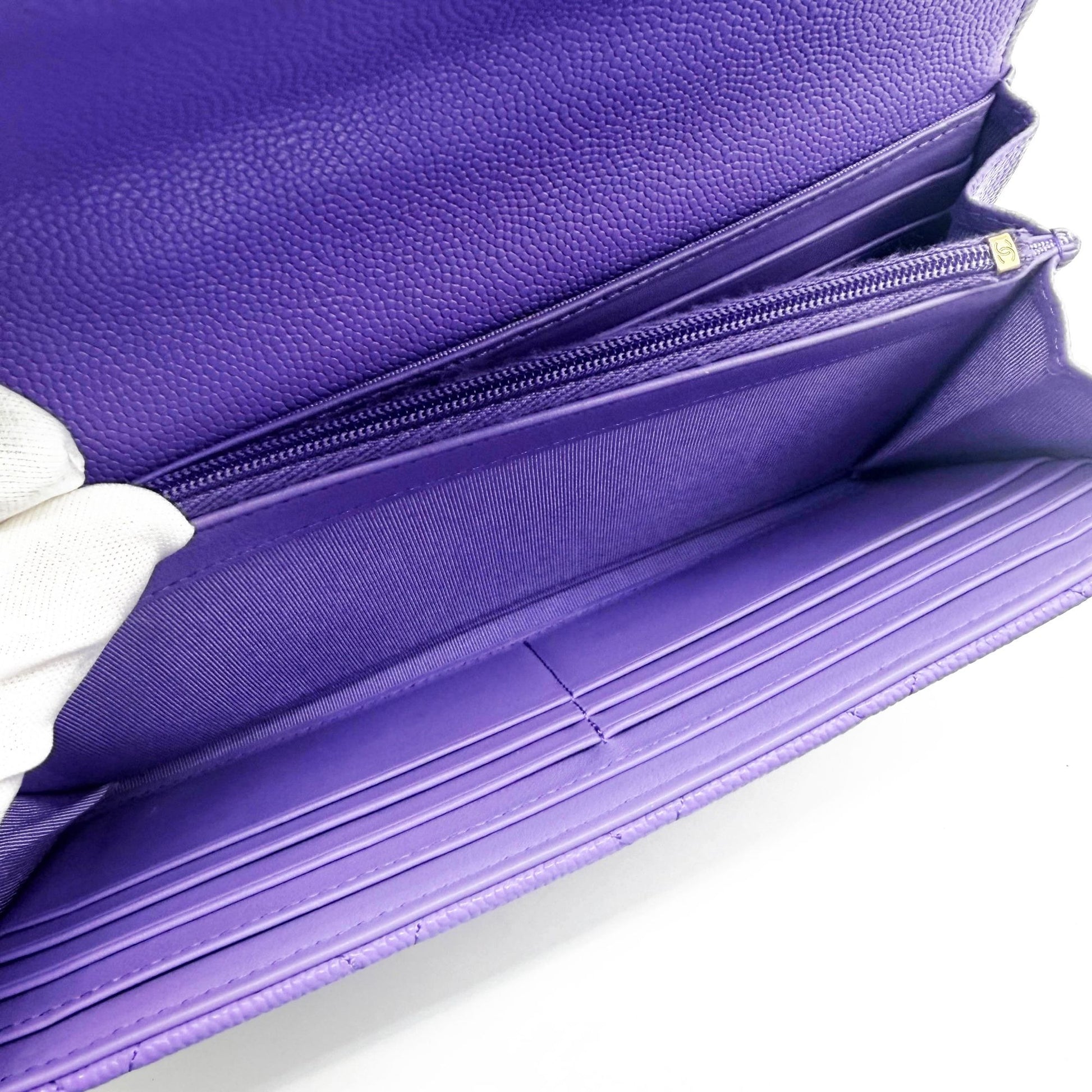 This is an authentic CHANEL CC Classic Timeless Caviar Leather Gusset Flap Wallet in Purple. This hard to find wallet features a gold interlocking CC logo at the front and opens to a matching purple interior with multiple card pockets, open pockets and zipper pockets. Gold hardware. This wallet features a custom added removable insert and chain, turning it into a wonderful daily carry as a shoulder bag, crossbody, or as a clutch. Serial sticker and Chanel Card intact, this is a timeless piece that will only go up in value!