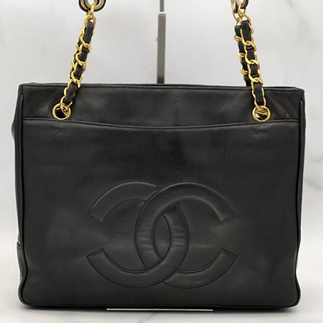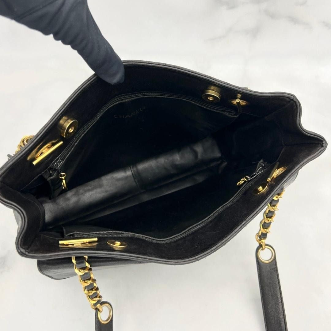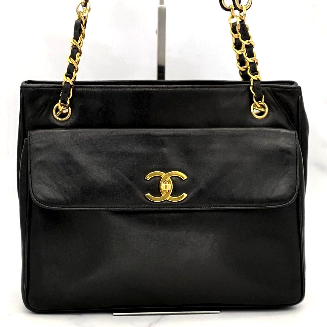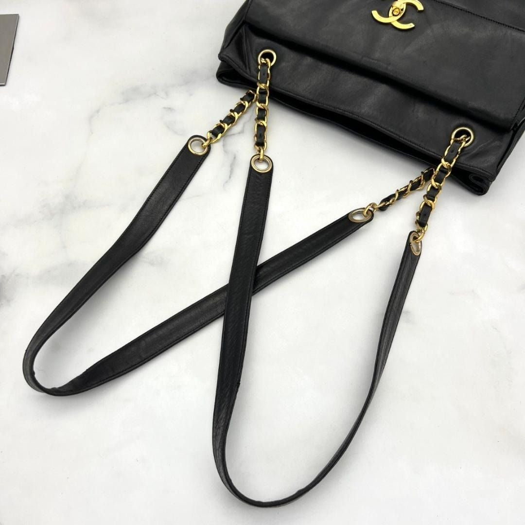 CHANEL CC Vintage Lambskin Black Gold Purse Bag Tote Chain Turnlock