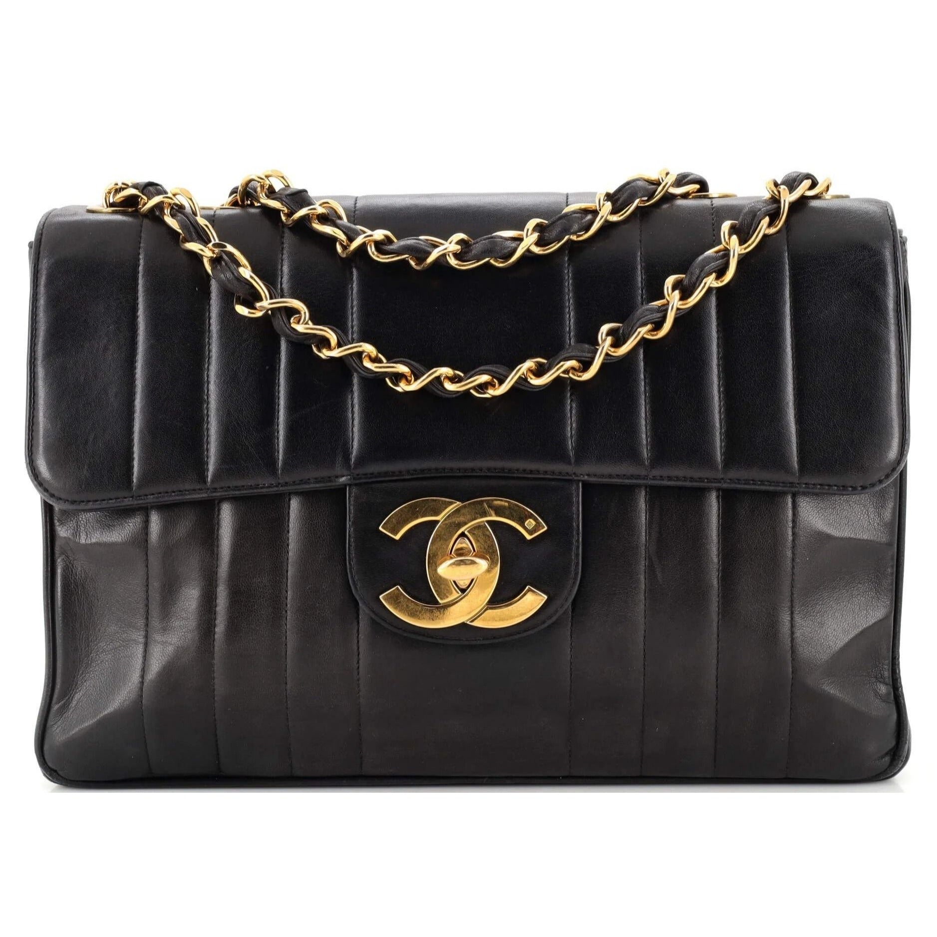 This is an authentic vintage CHANEL Jumbo Mademoiselle Lambskin Vertical Quilt Jumbo Single Flap in Black. This stunning classic flap bag is finely crafted of linear quilted luxurious black lambskin leather. The bag features gold chain link shoulder straps threaded with leather, a front flap, and an oversized gold-plated CC Chanel turnlock. It opens to a leather interior with a zipper and pockets. Serial sticker intact makes this an incredible investment piece!