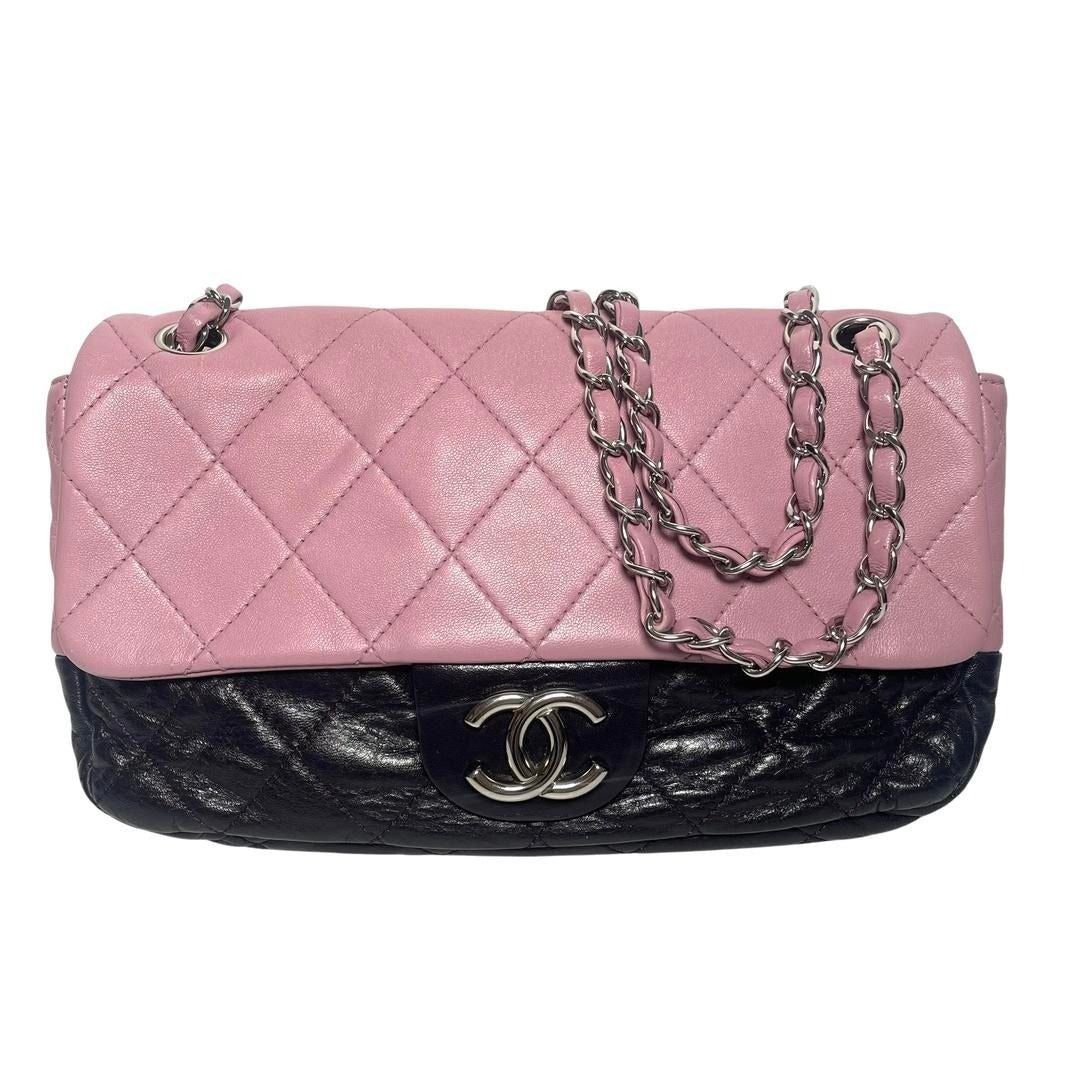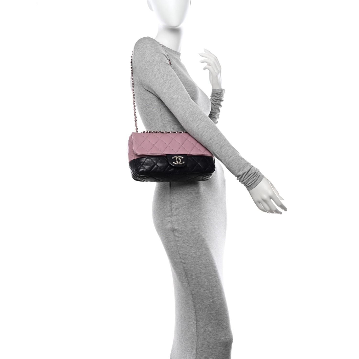 This is an authentic CHANEL Lambskin Quilted Bicolor Medium Single Flap in Light Purple / Pink. This stunning model is finely composed of luxuriously supple diamond quilted lambskin in lavender and a black leather bottom. The bag features a silver chain link, leather threaded shoulder strap and a silver Chanel CC faux Mademoiselle turn lock. This opens the frontal flap to a gray fabric interior with a zipper pocket. This is a marvelous shoulder bag for day or evening with the timeless quality and style of Chanel!