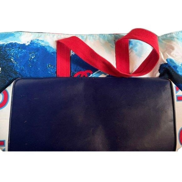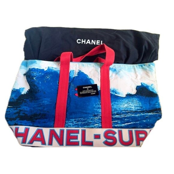 This is an authentic CHANEL Canvas Extra Large Surf Tote in Red and Blue. This tote is crafted of fabric canvas. It features an ocean wave print scene with a surfing red Chanel CC, a blue leather base, and red fabric straps. This opens to an off white fabric interior with PVC patch pockets and a zipper compartment. This is a stylish tote for day wear, from Chanel!