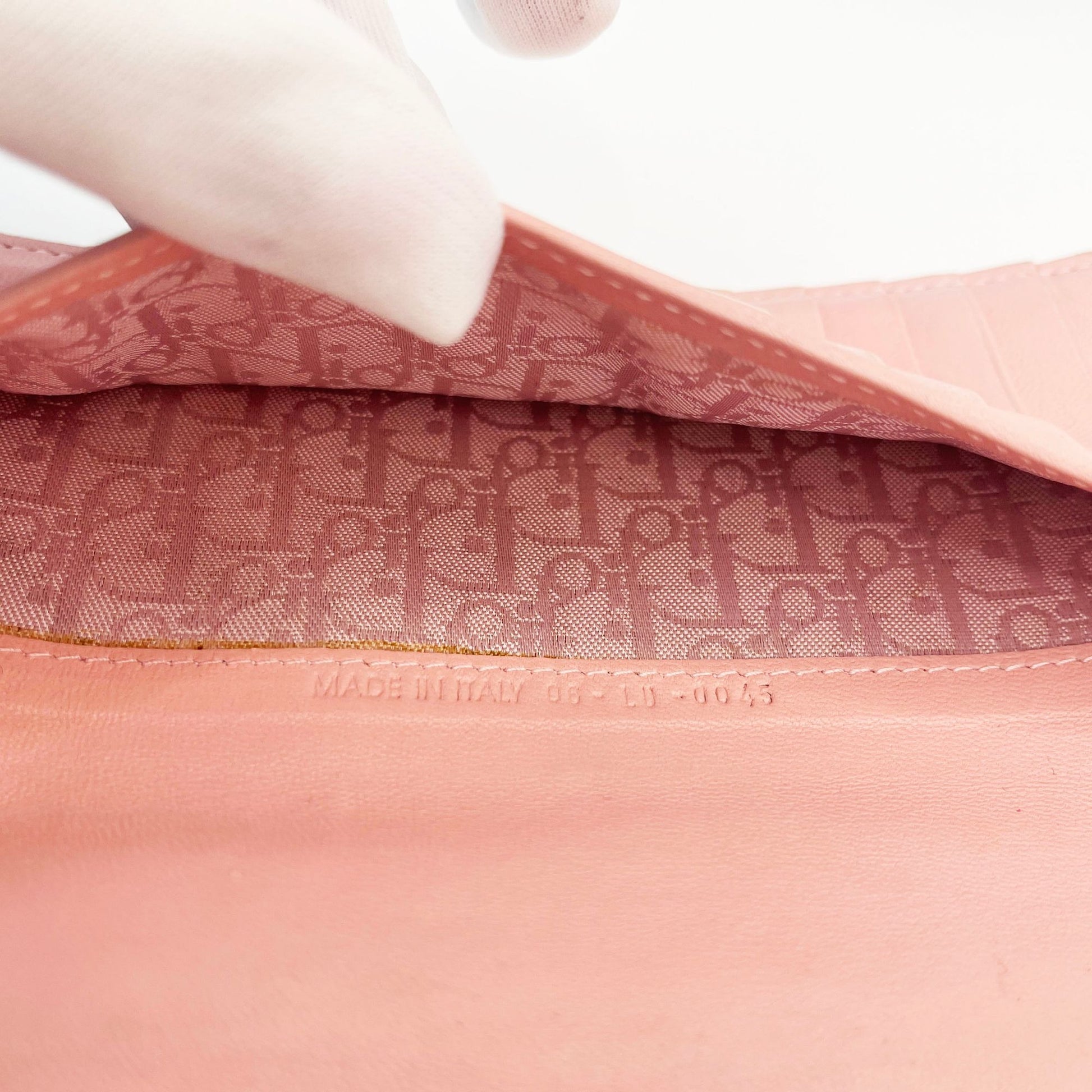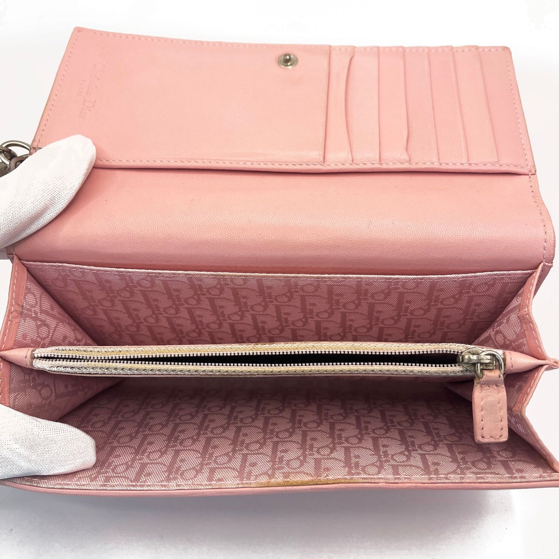 This is an authentic Dior Lady Dior Long Bifold Wallet in Pink Lambskin Leather, a chic accessory that channels the elegance of early 2000s Y2K style. Crafted from soft, quilted pink lambskin, this wallet embodies the classic charm of Dior with its iconic Cannage stitching, giving it a timeless look. The bifold design opens to reveal a well-organized interior featuring multiple card slots, a spacious bill compartment, and a secure zippered coin pocket for all your essentials. Color maintenance performed. Signs of wear: rubs, hairline scratches, hardware wear, stains. With its delicate pink hue and luxurious feel, this Lady Dior wallet is the perfect blend of style and functionality, adding a touch of sophistication to your everyday essentials. A must-have for Dior lovers and Y2K fashion enthusiasts alike!