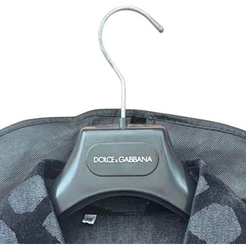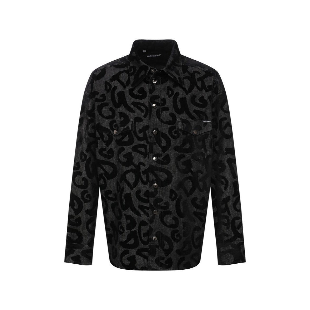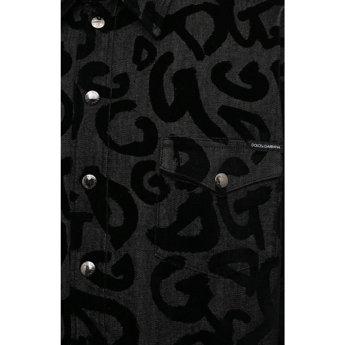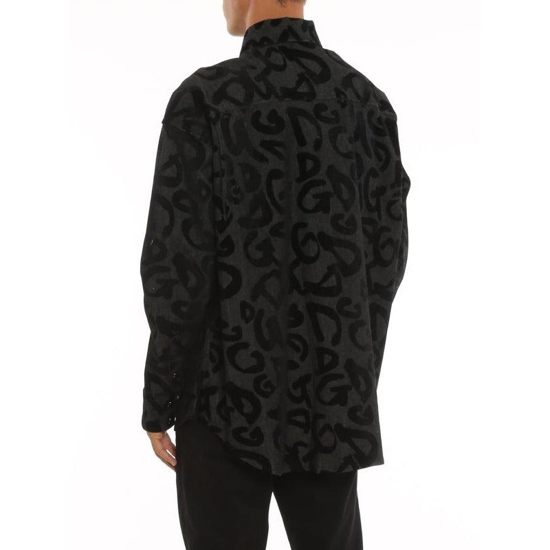 This is an authentic Dolce & Gabbana Denim Dress Shirt Jacket in Denim Black / Grey. Long Sleeve, button down. Graphic design. Size 44. Hanger included.