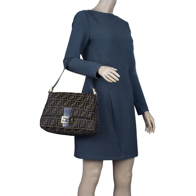This is a RARE authentic FENDI Zucca Mamma Bucket Baguette in Tan / Tobacco Brown GHW. This stylish bag is crafted of canvas. It features an adjustable leather shoulder strap and a bold gold Fendi logo on the front. The crossover flap opens to a dark fabric interior with a zipper pocket. Made in Italy. Magnetic snap fastening. Gold hardware throughout. This is a chic bag that is suitable for everyday wear, from Fendi!