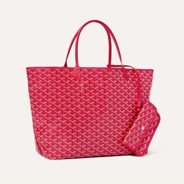 This is a RARE LIMITED EDITION 2025 authentic GOYARD Goyardine Le Jardin Saint Louis PM in Fuchsia. This tote is crafted of Goyardine chevron coated canvas in pink. It features leather trim and leather shoulder straps. The top is open to a beige and multicolor floral canvas interior with a matching removable pouch.