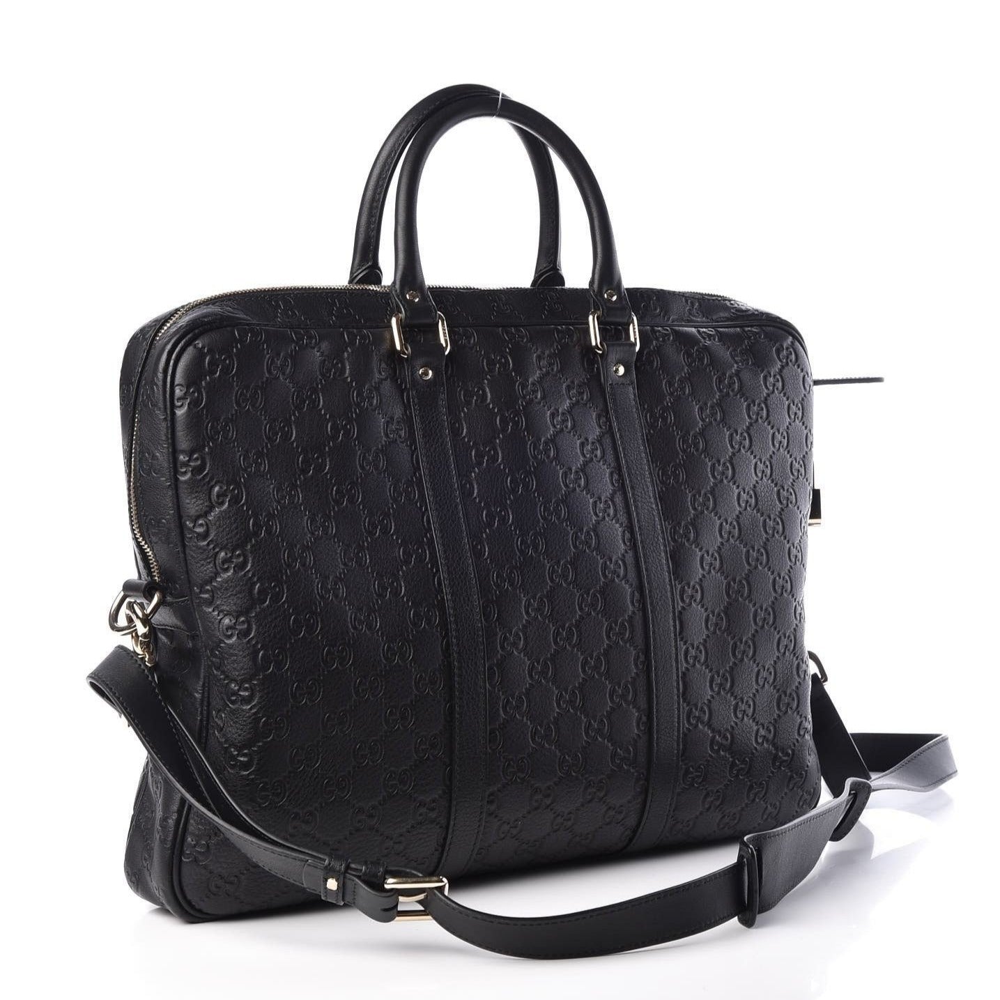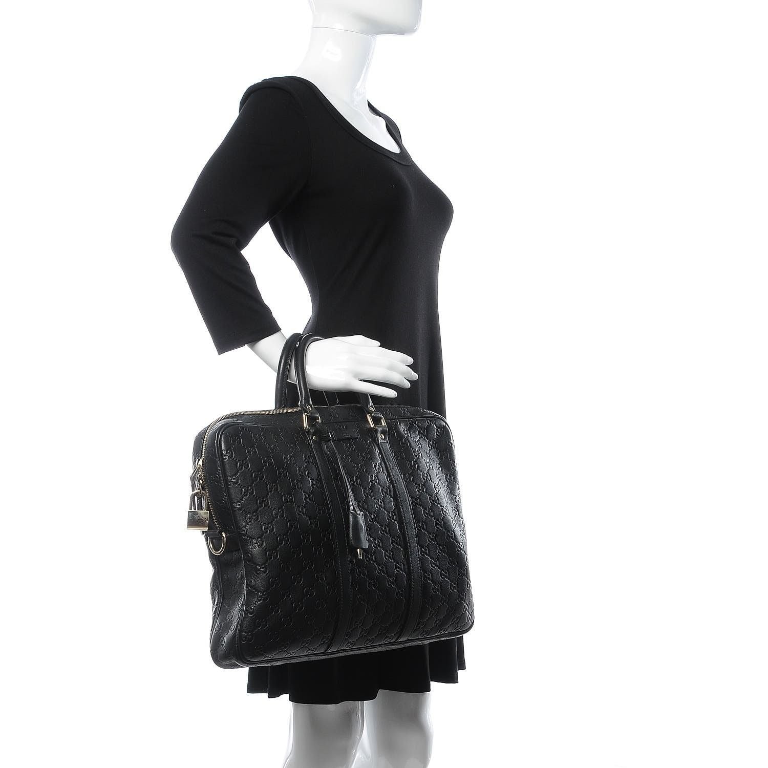 This is an authentic GUCCI Guccissima Signature Briefcase in Black. This stylish soft briefcase is crafted of heat embossed Gucci Signature leather, resulting in a defined print with a firm texture. The bag features rolled leather top handles, silver hardware and an optional adjustable canvas shoulder strap. The top zippers open to a roomy partitioned microfiber interior with a large zipper pocket. This is a fantastic briefcase, ideal for personal or professional use, by Gucci!