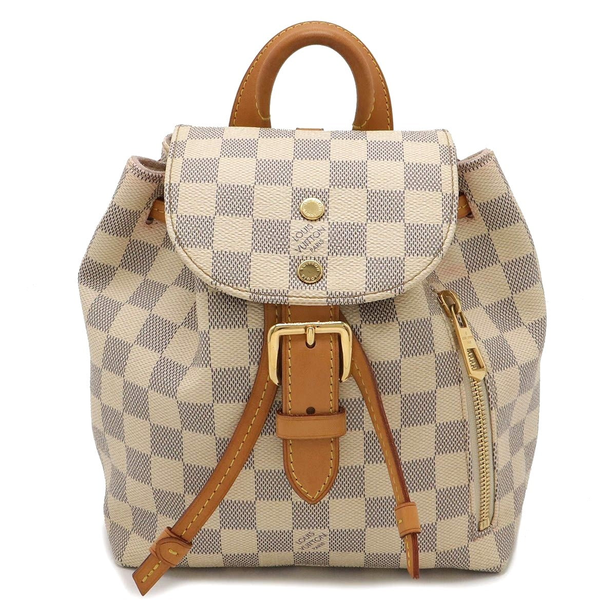 This is an authentic LOUIS VUITTON Damier Azur Sperone BB Backpack. This stylish backpack is crafted of signature Louis Vuitton Damier canvas in blue and white. The backpack features adjustable natural vachetta cowhide leather shoulder straps, top handle, and cinch-cord. The bag also features polished brass hardware, an exterior zip pocket, and a crossover flap with a belt closure. The top opens to a light pink microfiber interior with a patch pocket and a D-ring.