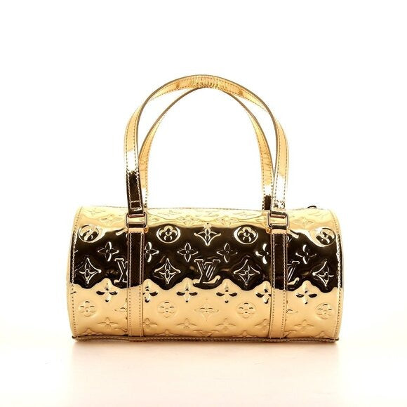 This is an authentic LOUIS VUITTON Miroir Mirror Papillon in Gold. This stunning tote is finely crafted of shiny gold patent leather embossed with the Louis Vuitton monogram. The bag features gold leather trim and top handles with gold hardware. The top zipper opens to an ivory fabric interior. This is a stylish tote that will be ideal for day or evening and just the essentials from Louis Vuitton! A celebrity favorite in the 2000s and classic Y2K style bag. A collector's dream!