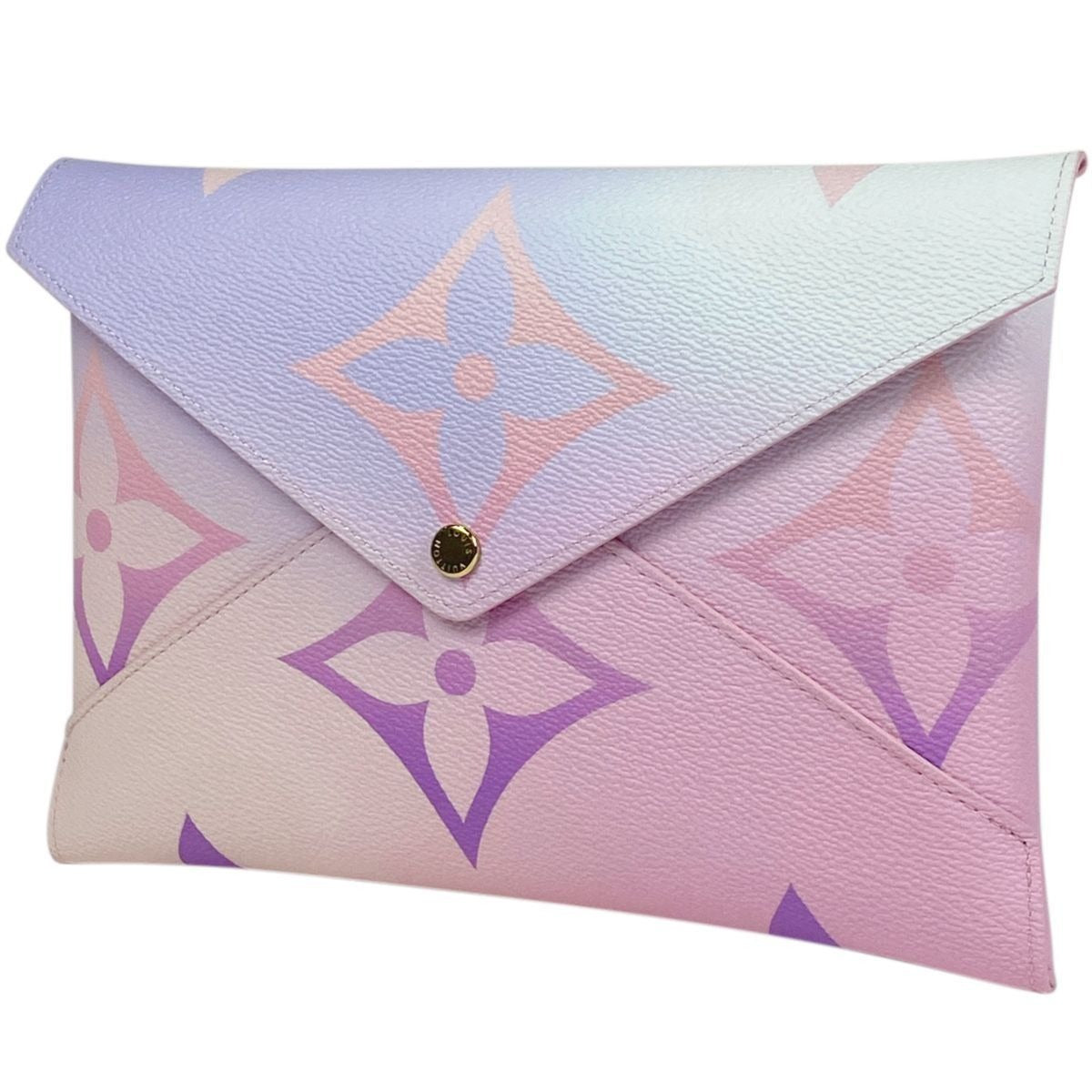 This is an authentic LOUIS VUITTON Monogram Giant Spring In The City Kirigami Pochette in Sunset Pastel. This is part of the Louis Vuitton Spring 2022 “Spring in the City” collection. This limited edition features versions of the classic Louis Vuitton monogram canvas in pastel shades of pink and blue. The large size insert features a gold snap button and opens to a pink leather interior.